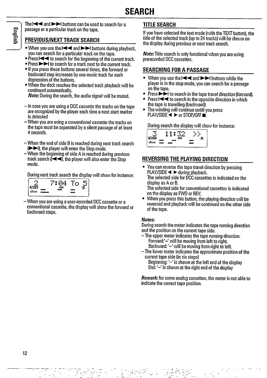 Philips DCC 170 - SEARCH; Track Search; Passage Search; Reversing Playback Direction
