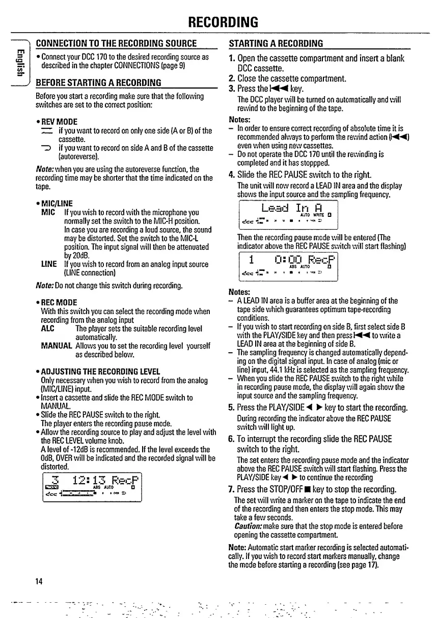 Philips DCC 170 - RECORDING; Before Starting Recording; Adjusting Recording Level; Starting a Recording