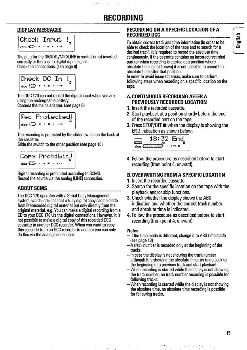 Philips DCC 170 - Recording on Specific Location; Display Messages