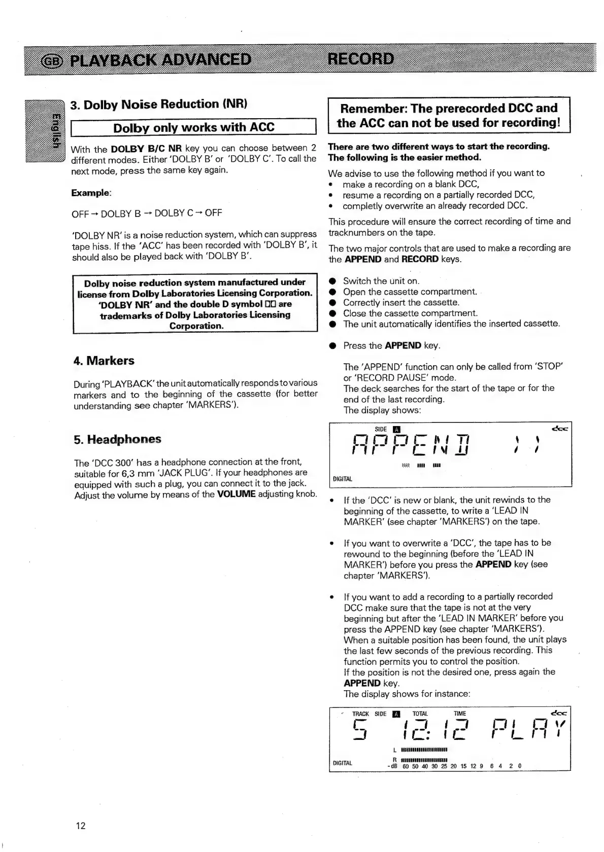Philips DCC 300 - Dolby Noise Reduction for ACC; Marker Functionality During Playback; Headphone Connection and Volume; Recording Process Initiation
