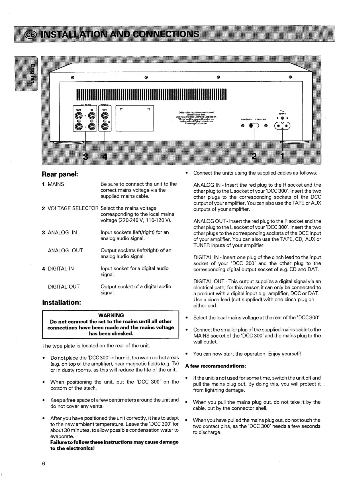 Philips DCC 300 - Installation and Connections; Rear Panel Connections; Installation Guidelines and Warnings; Connecting External Components