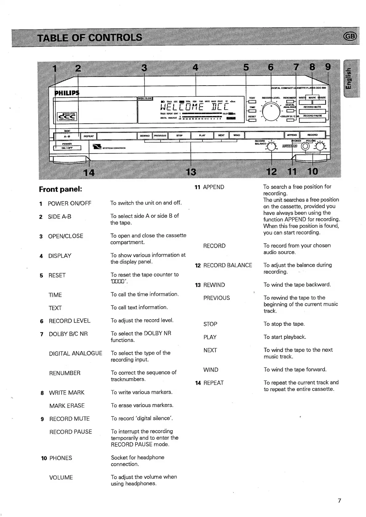 Philips DCC 300 - Front Panel Controls Overview; Power and Cassette Compartment Controls; Playback and Navigation Controls; Recording and Audio Adjustment Controls