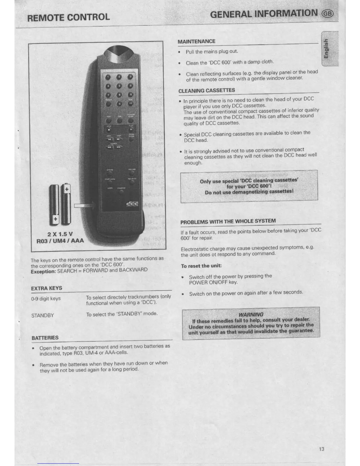 Philips DCC 600 - Remote Control and General Information; Maintenance and Cleaning; Cassette Cleaning Advice; System Troubleshooting
