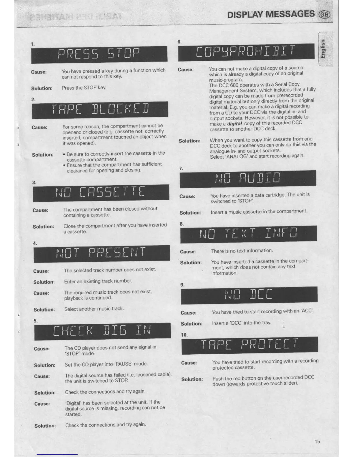 Philips DCC 600 - Display Messages and Troubleshooting; Press Stop Error; Tape Blocked Error; No Cassette Error
