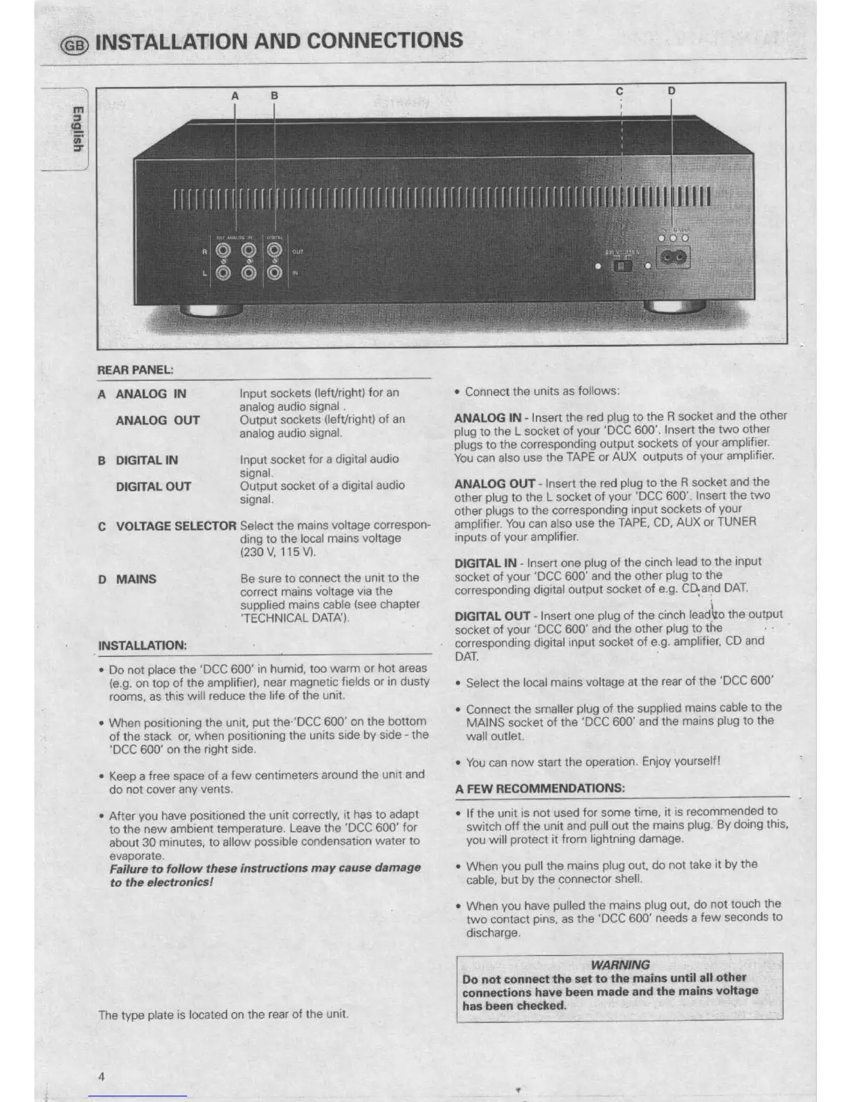 Philips DCC 600 - Installation and Connections; Rear Panel Connections; Installation Recommendations; System Recommendations