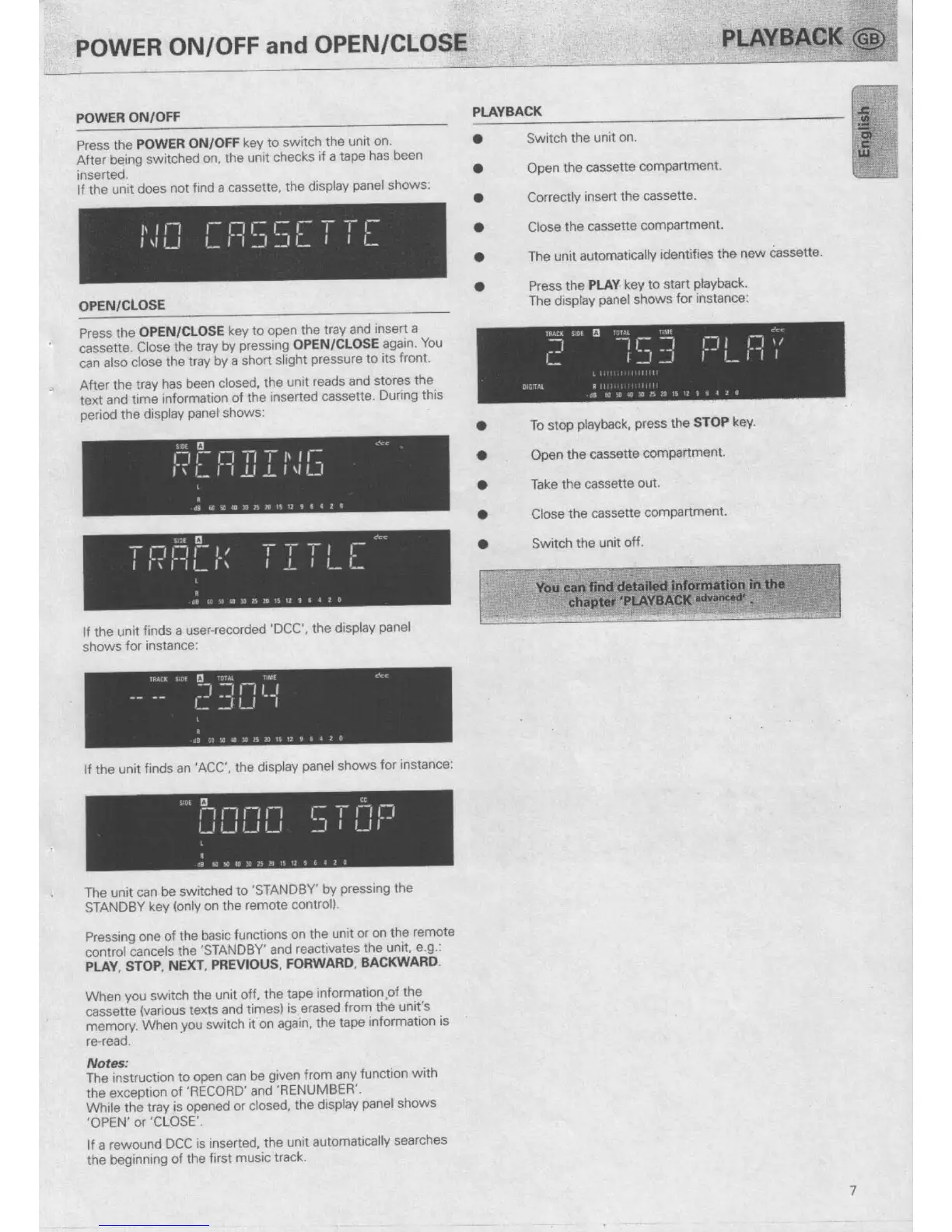 Philips DCC 600 - Power On;Off and Open;Close; Cassette Compartment Operation; Playback Operation; Starting and Stopping Playback