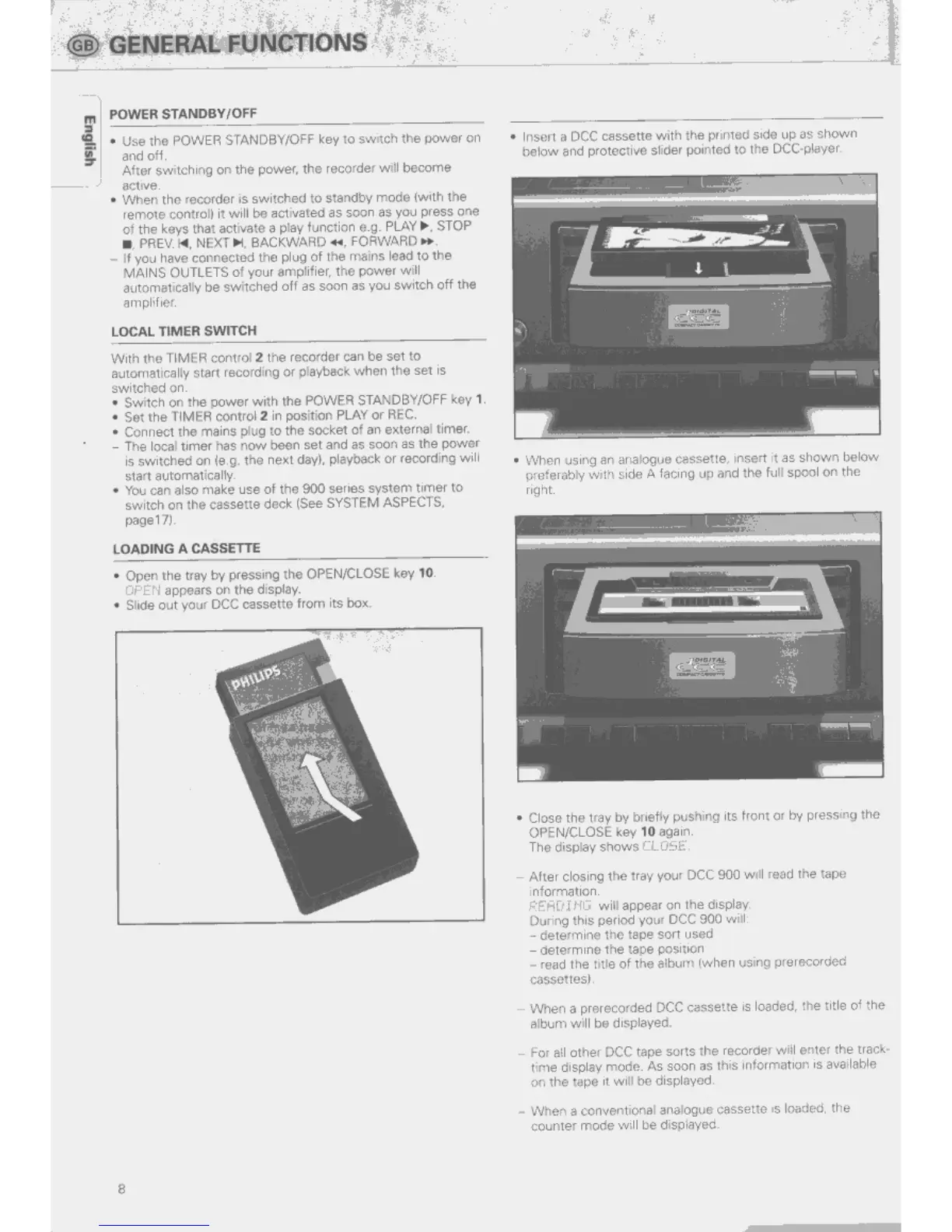 Philips DCC 900 - General Functions; Power Standby;Off; Local Timer Switch; Loading a Cassette