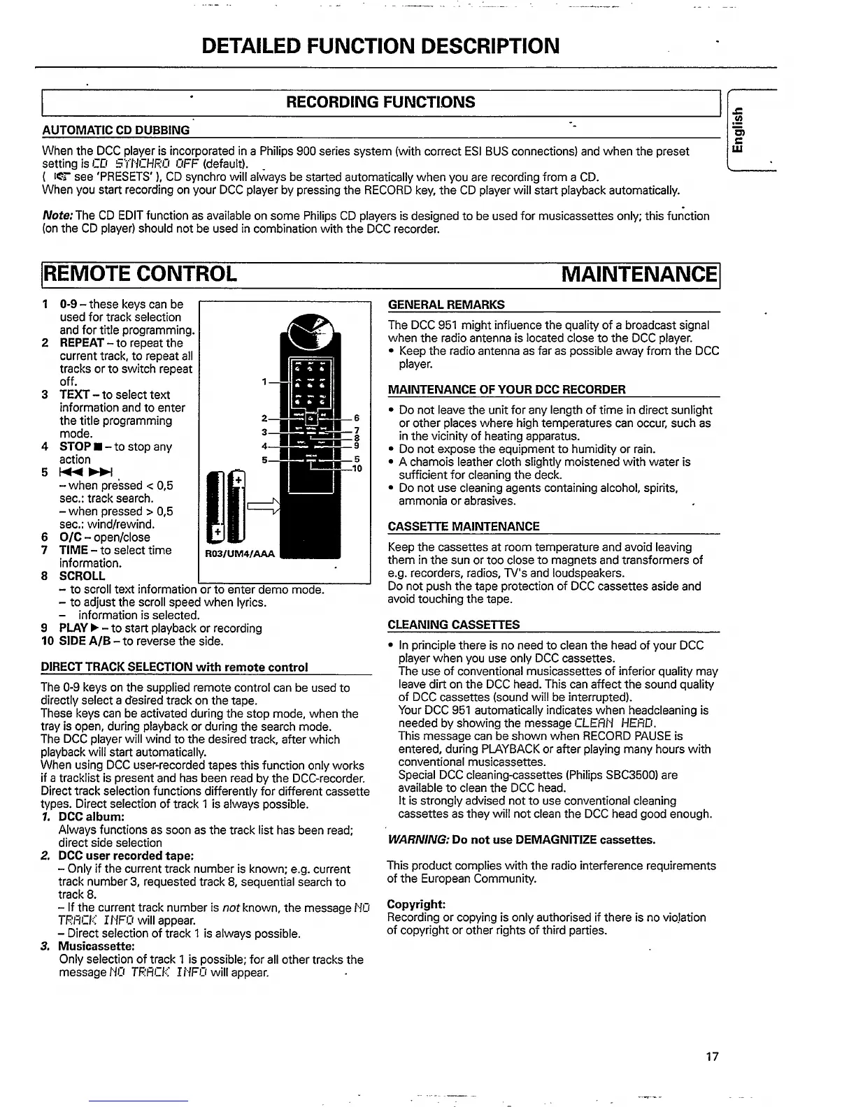 Philips DCC951/17S - Remote Control; Maintenance; Automatic CD Dubbing; Direct Track Selection with Remote Control