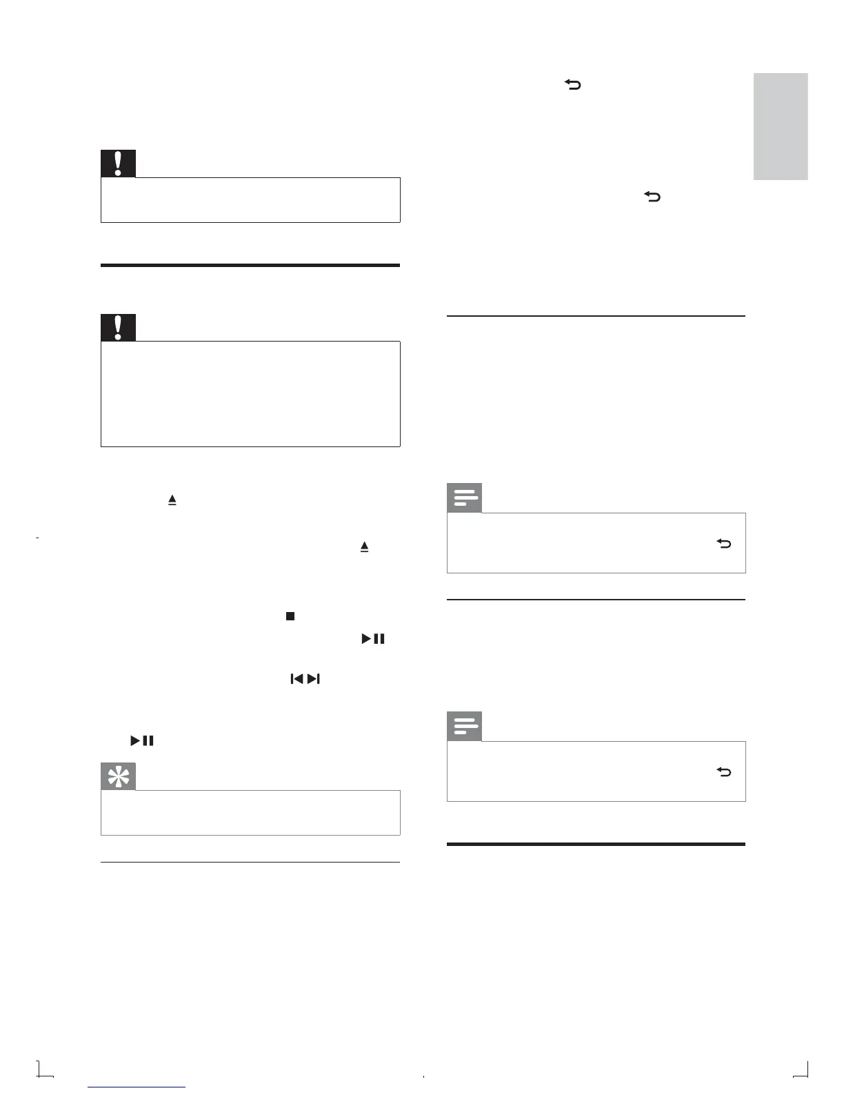 Risk of product damage! Never play discs with •