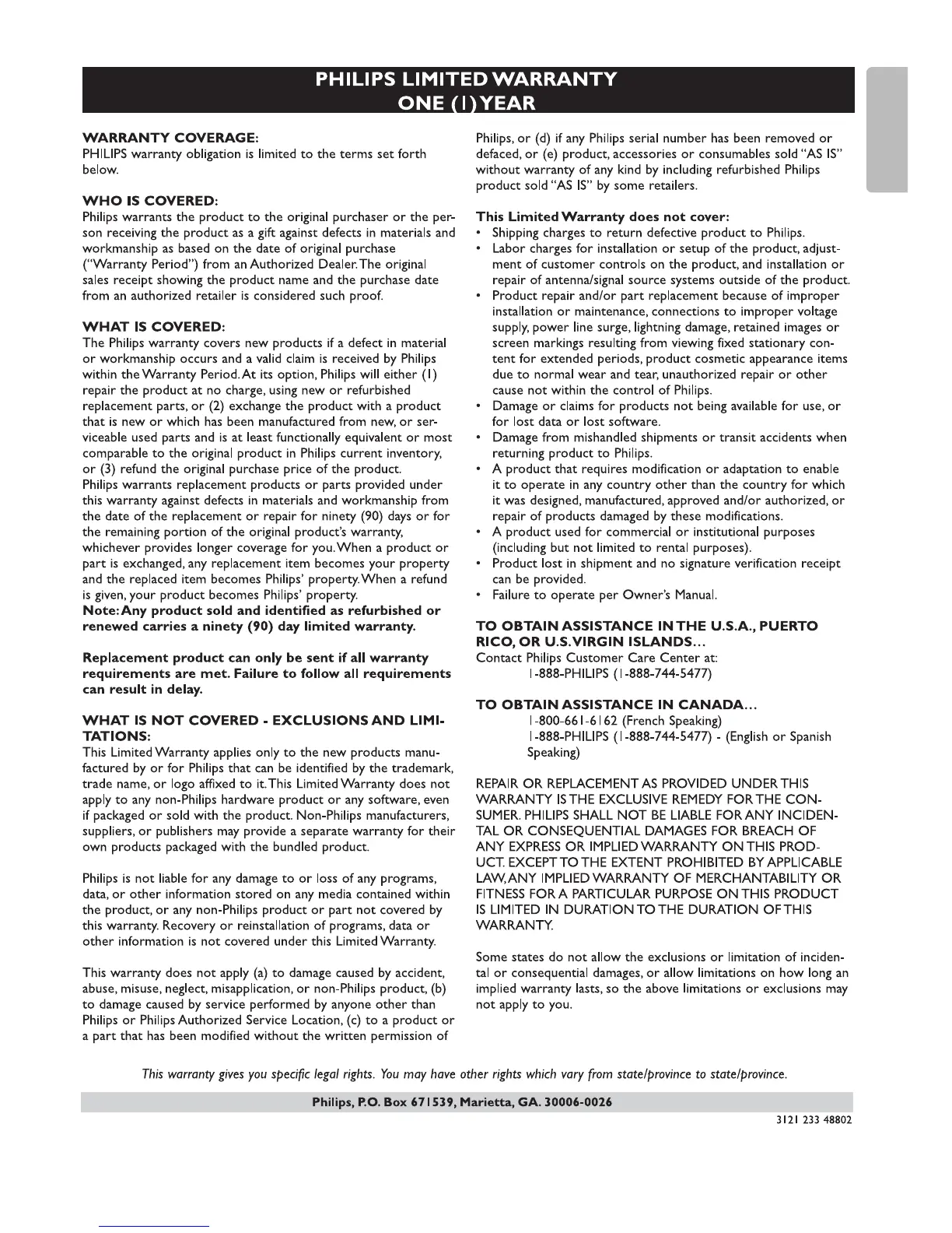 Philips DCM250 - Philips Limited Warranty; Warranty Scope and Coverage; Customer Assistance Information