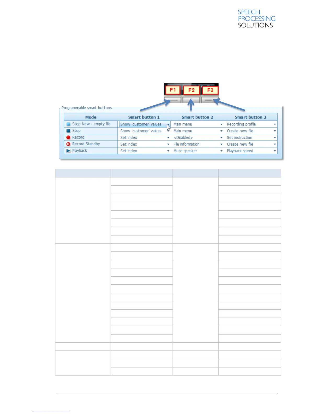 Here you can customize the role and behaviour of the Smart buttons 1-3 on the selected recorder to