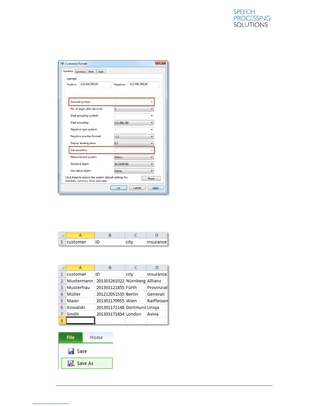 Check or set the characters for Decimal symbol and for List separator.