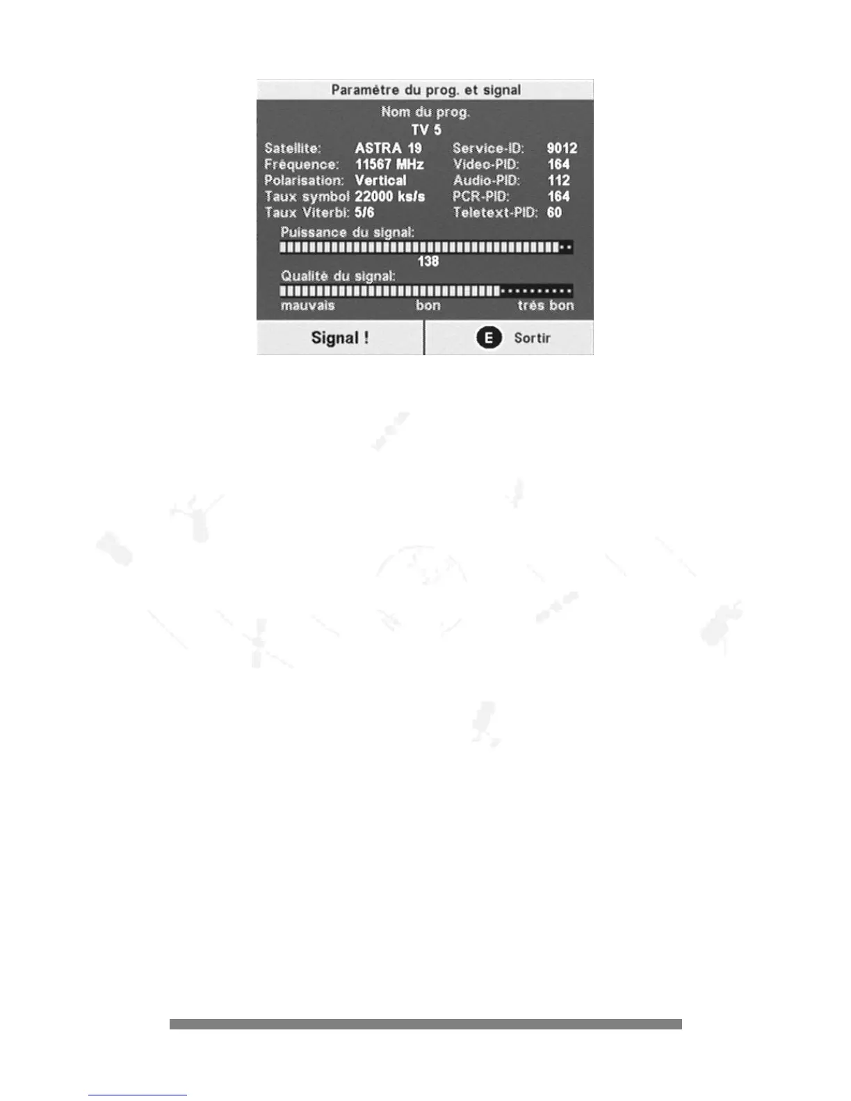 Si nécessaire, vous pouvez ajuster votre antenne parabolique avec le sous-menu «Signal