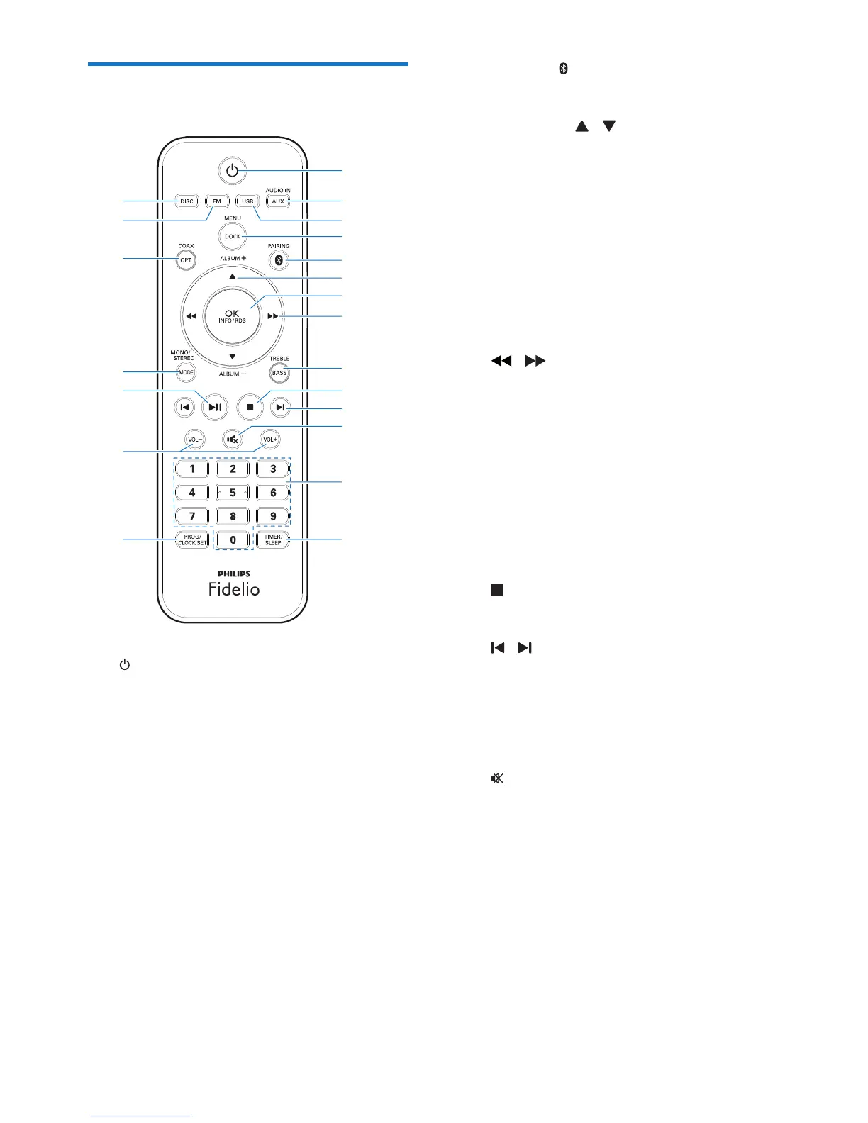 • In Disc/USB/Dock source, press to skip