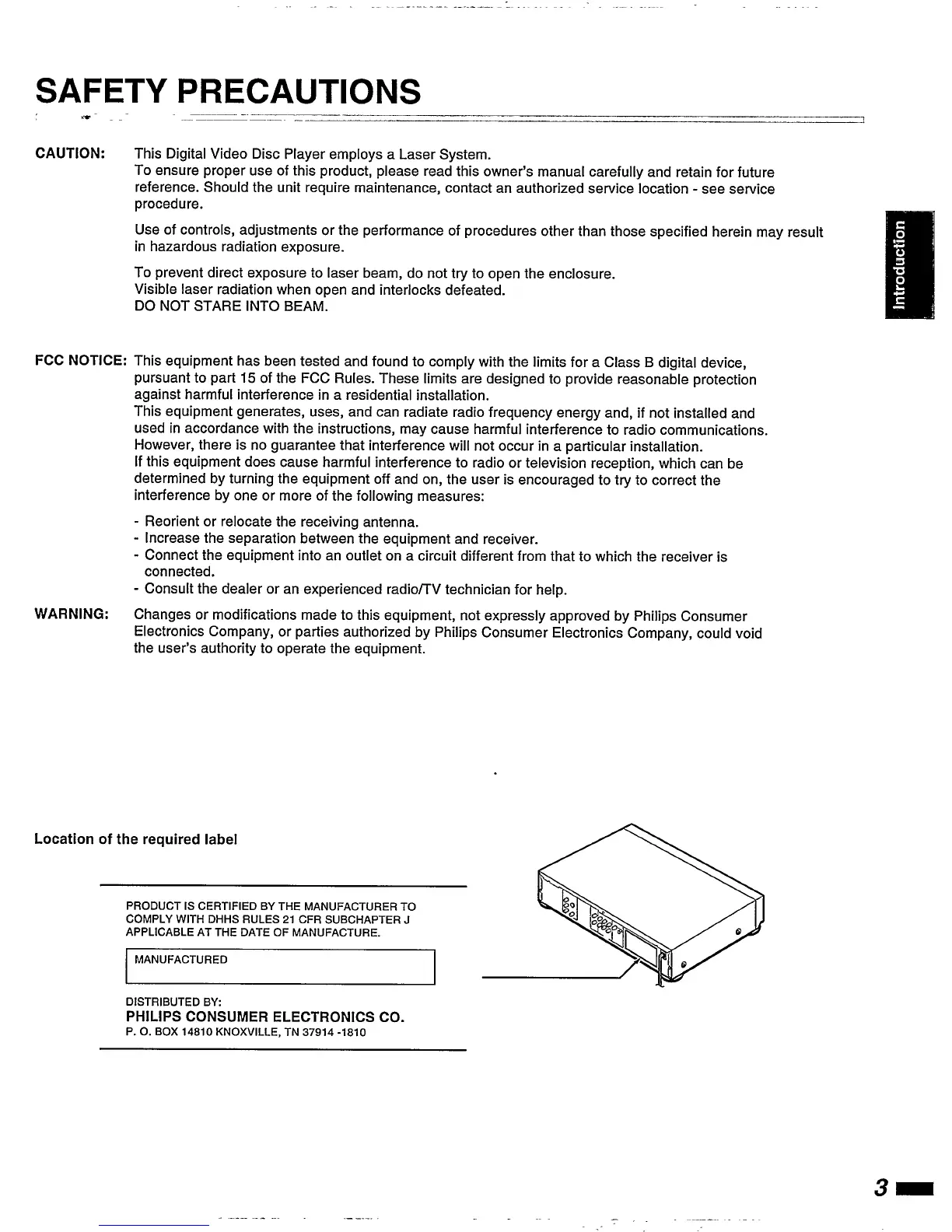 Philips DVD Player - Safety Precautions; Laser System and FCC Safety Notices