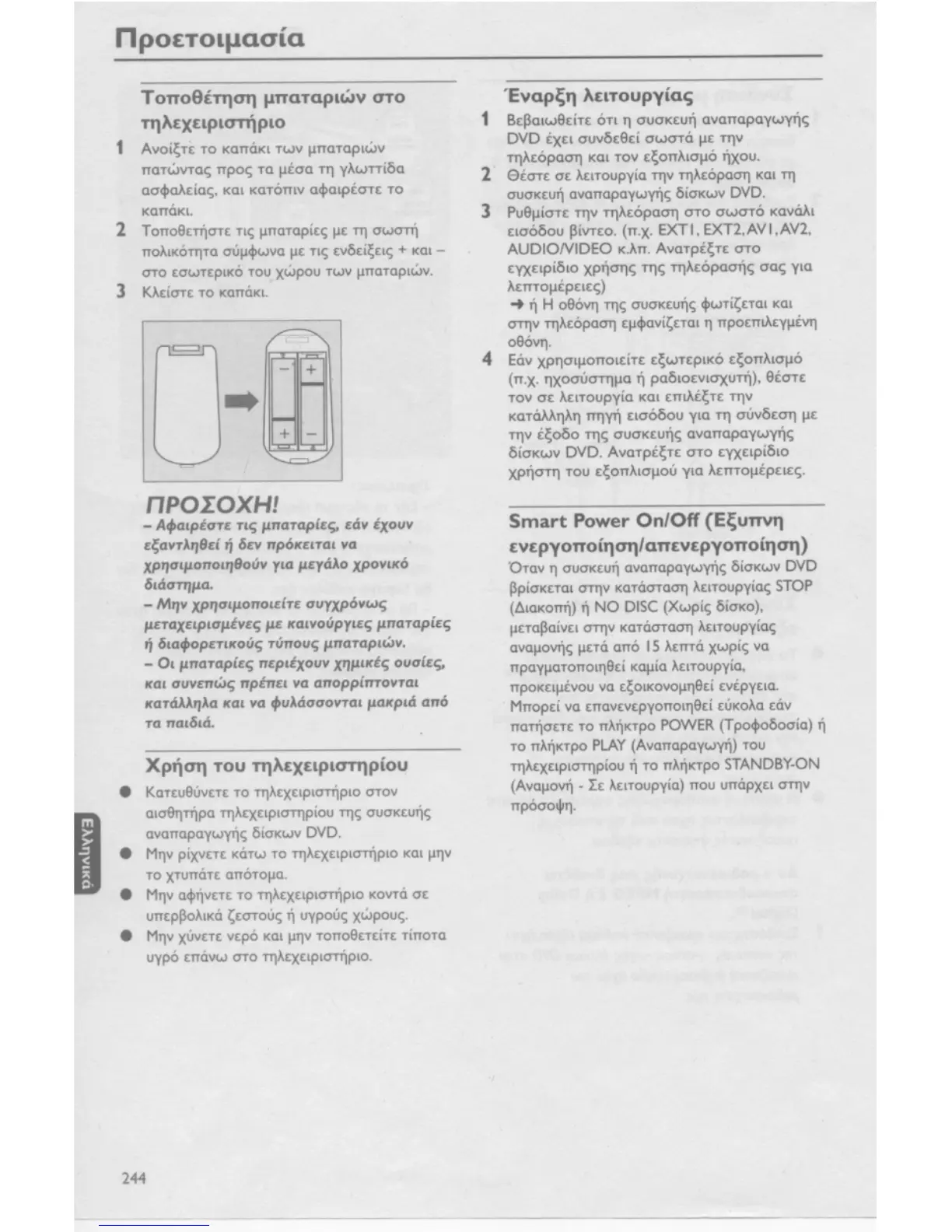 Philips DVD625 - Remote Control Battery Installation; Starting Operation; Smart Power On;Off Feature