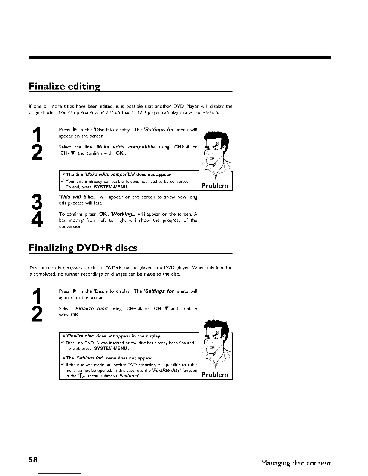 Select 'Finalize disc' using CH+A or CH-V and confirm