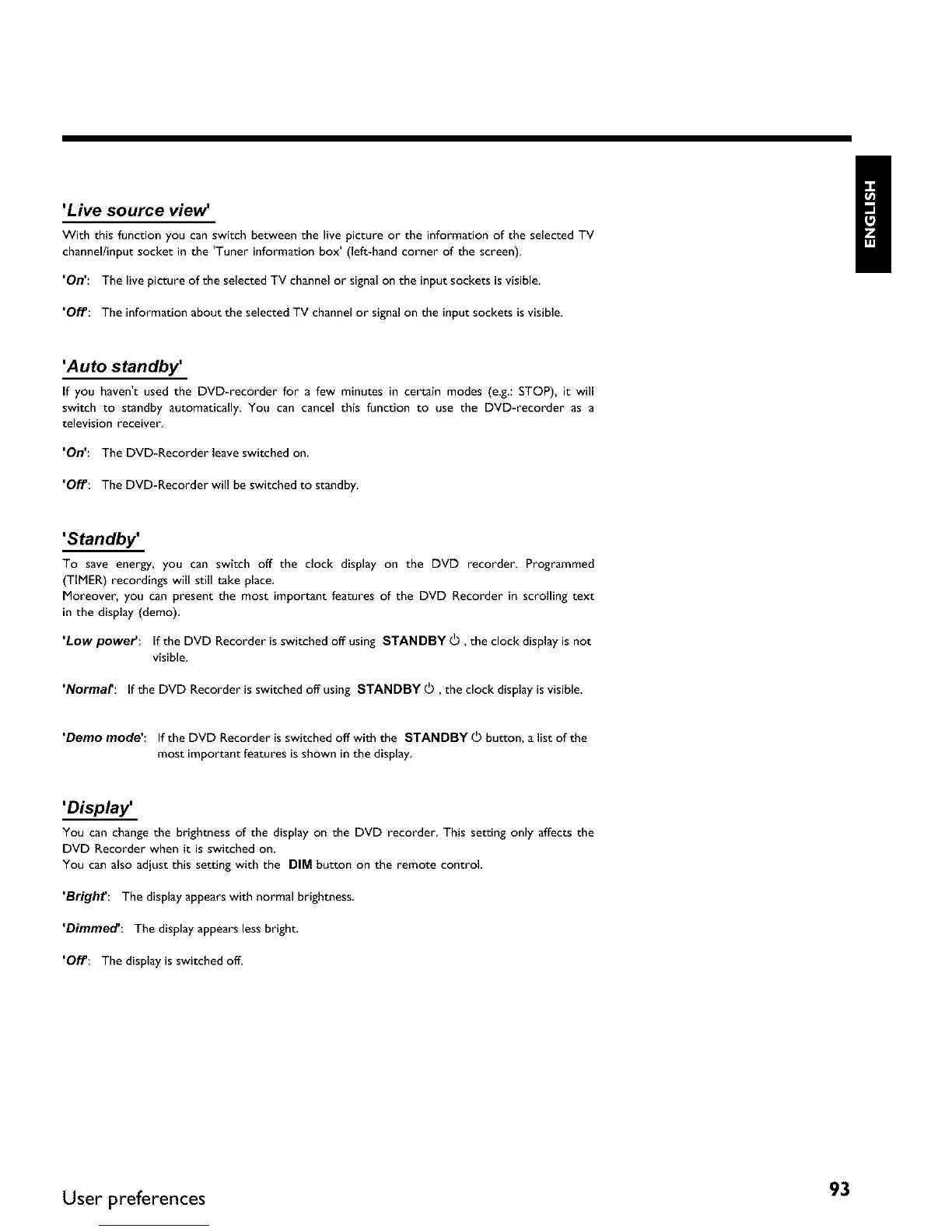 'Normal': If the DVD Recorder is switched off using STANDBY _), the clock display is visible.
