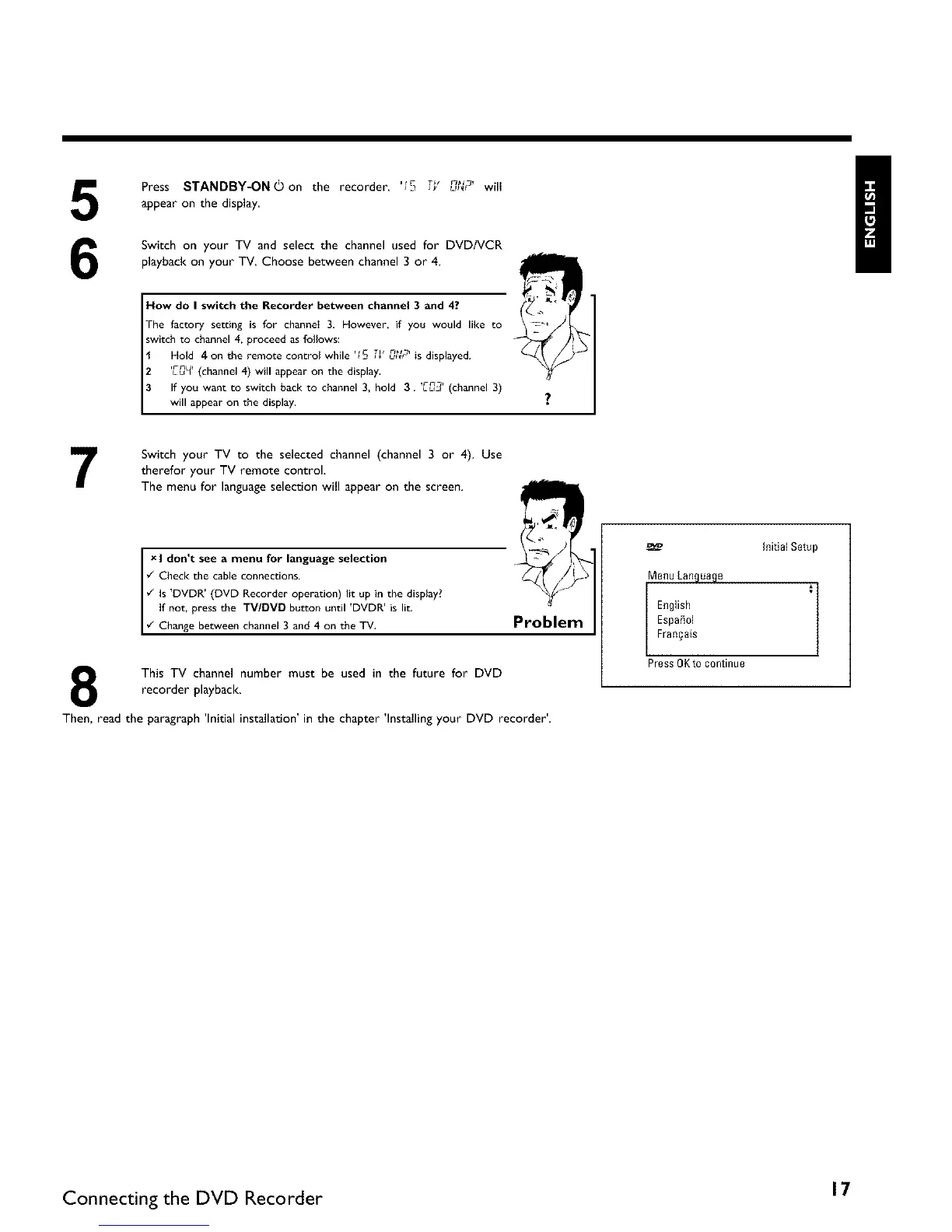 Then, read the paragraph 'Initial installation' in the chapter 'Installing your DVD recorder'.