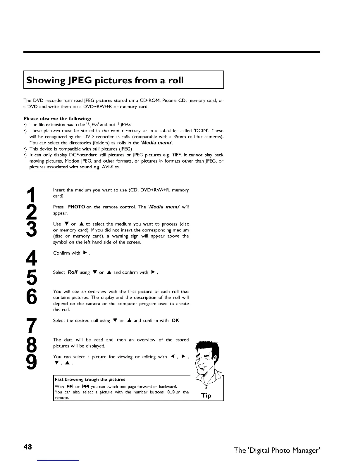 The DVD recorder can read JPEG pictures stored on a CD-ROM, Picture CD, memory card, or