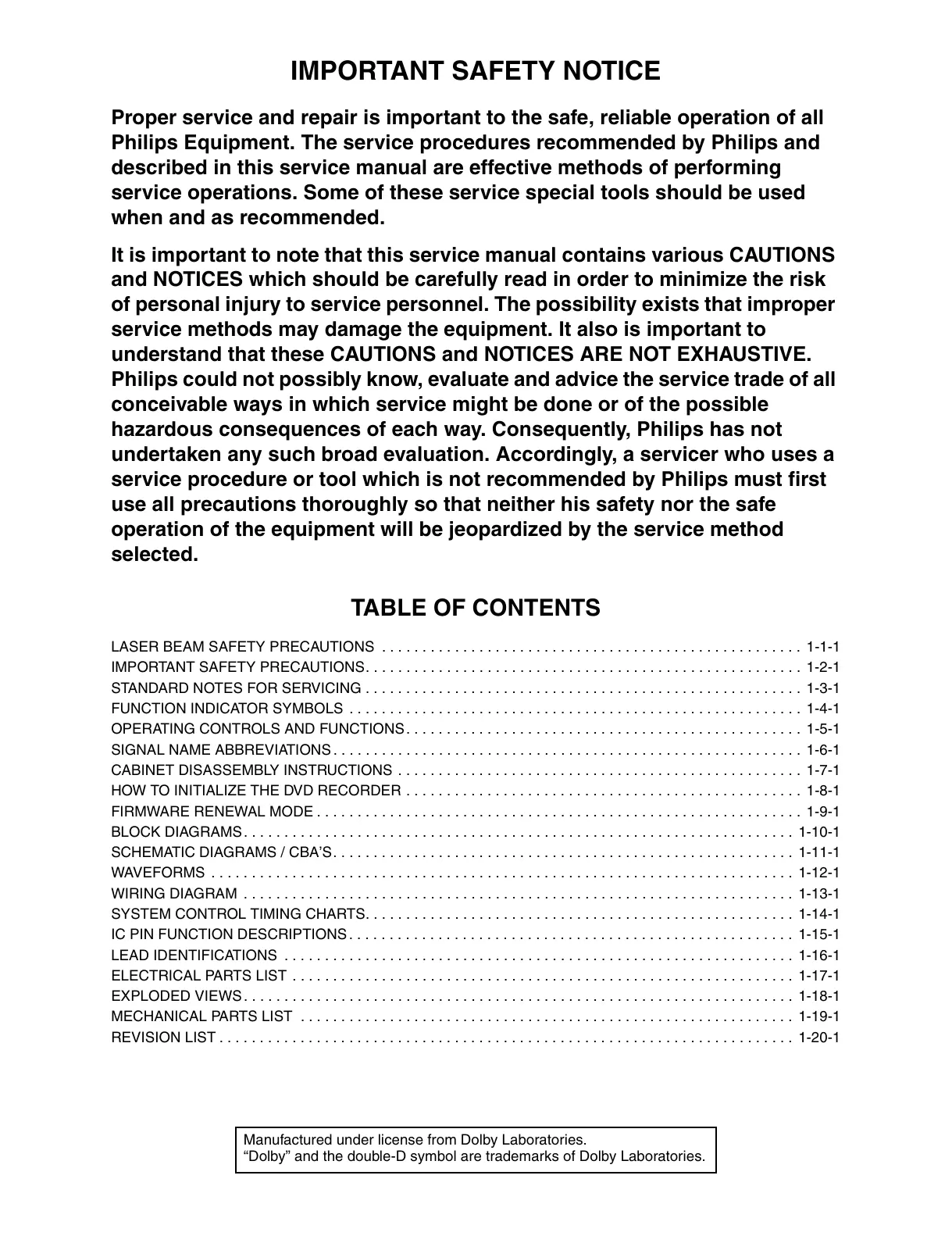 IMPORTANT SAFETY PRECAUTIONS. . . . . . . . . . . . . . . . . . . . . . . . . . . . . . . . . . . . . . . . . . . . . . . . . . . . . . 1-2-1