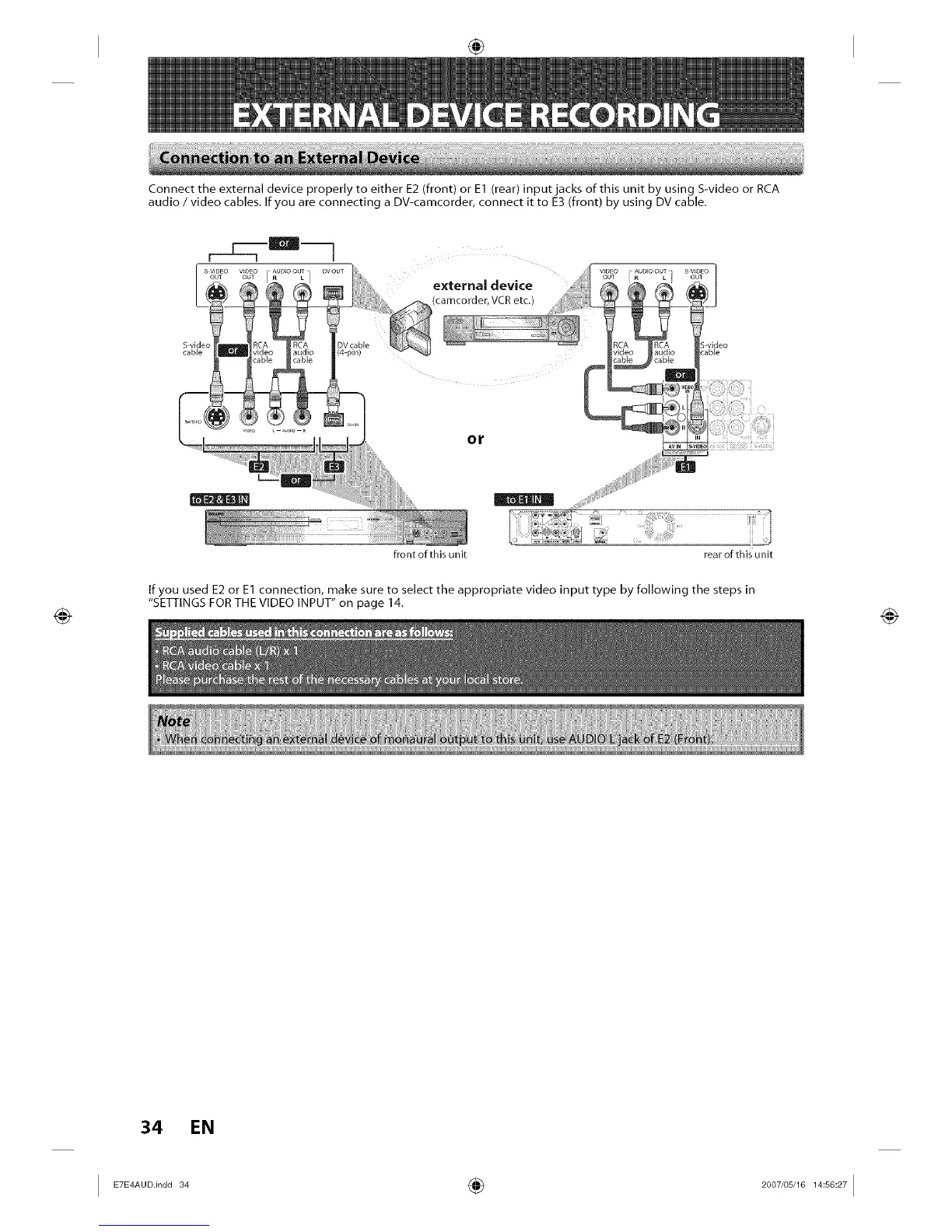 Connect the external device properly to either E2 (front) or E1 (rear) input jacks of this unit by using S-video or RCA