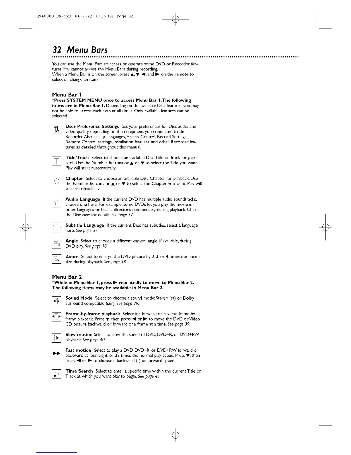 You can use the Menu Bars to access or operate some DVD or Recorder fea-