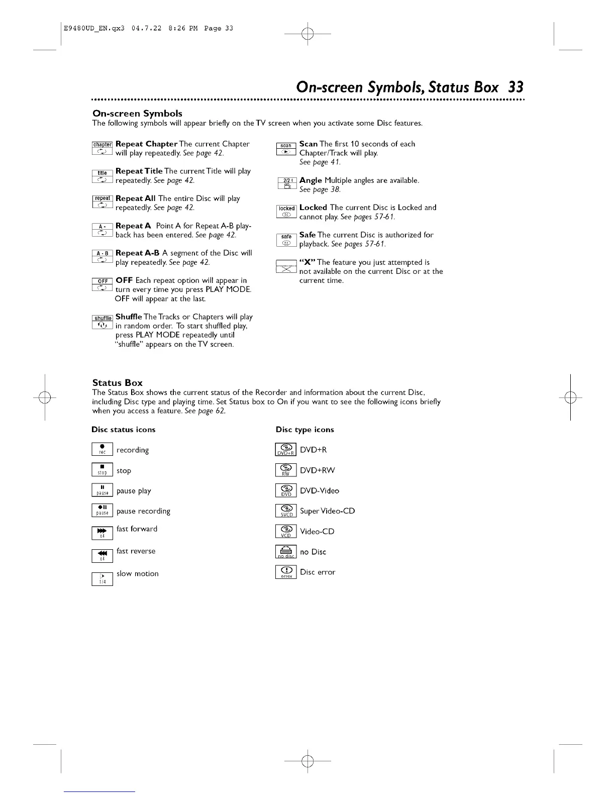 including Disc type and playing time. Set Status box to On if you want to see the following icons briefly
