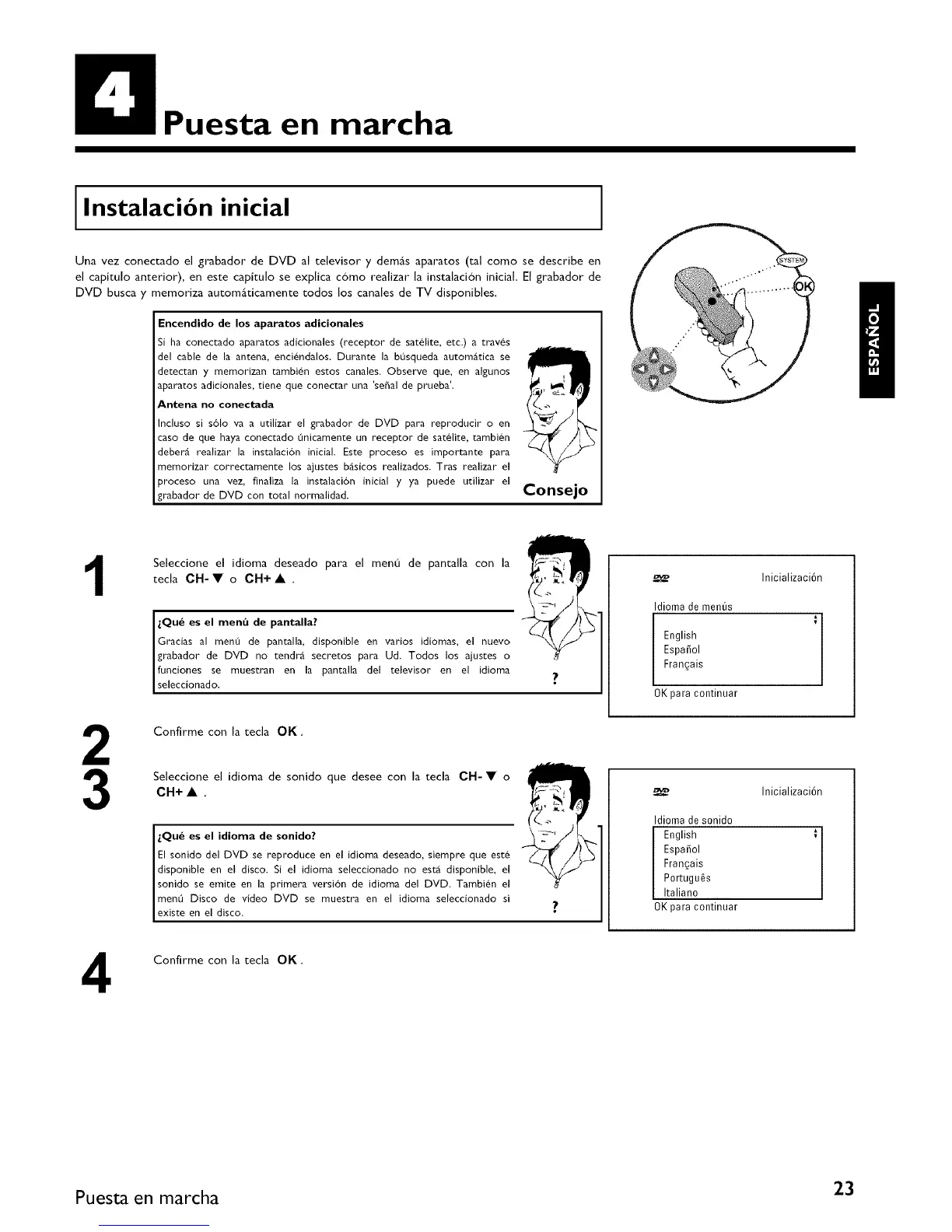 Seleccione el idioma deseado para el menO de pantalla con la