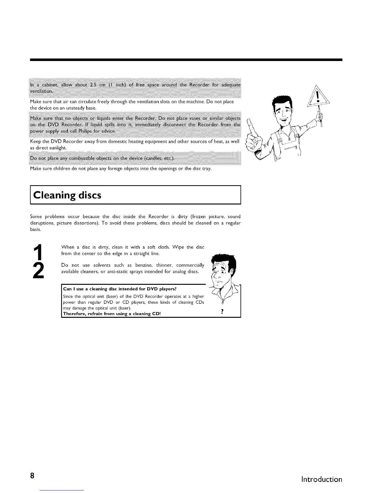 Keep the DVD Recorder away from domestic heating equipment and other sources of heat, as well