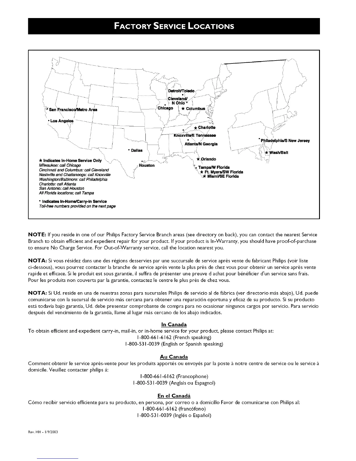 NOTE: If you reside in one of our Philips Factory Service Branch areas (see directory on back), you can contact the nearest Service