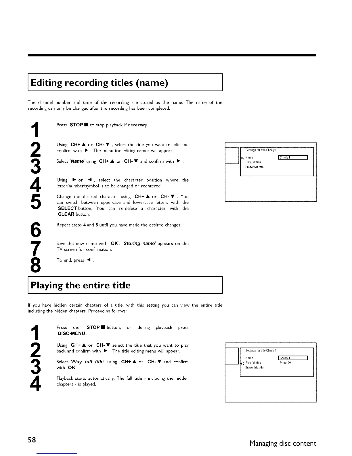 Select 'Play full title' using CH+ • or CH-• and confirm