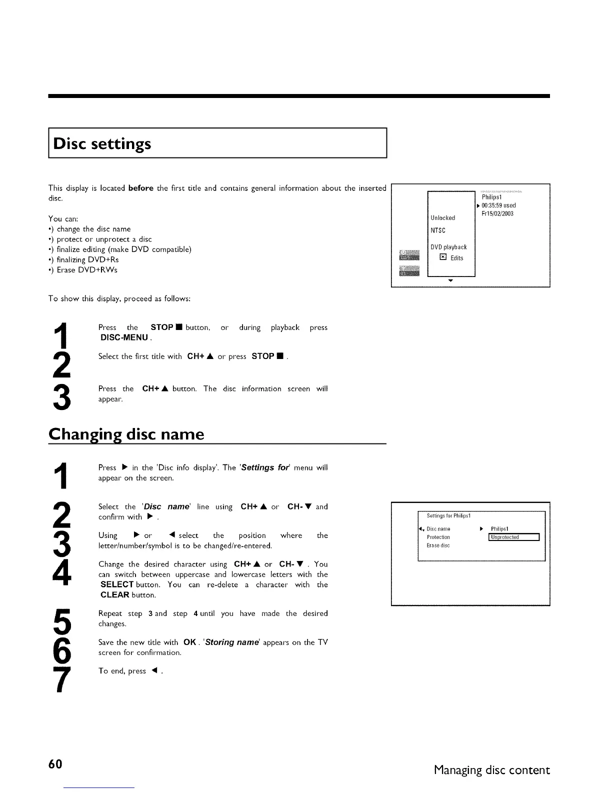 Select the 'Disc name' line using CH+ • or CH-V and