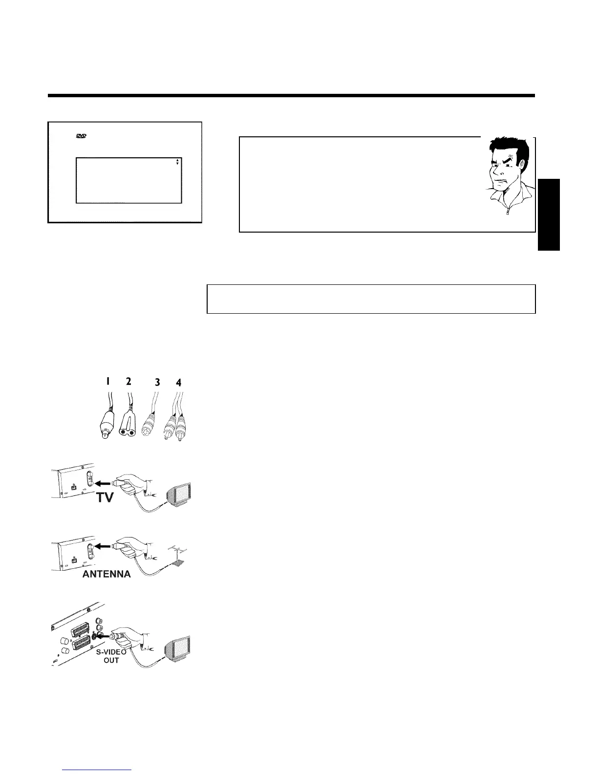 an aerial cable (1, supplied), a mains cable (2, supplied), an S-Video(SVHS) cable (3), an audio