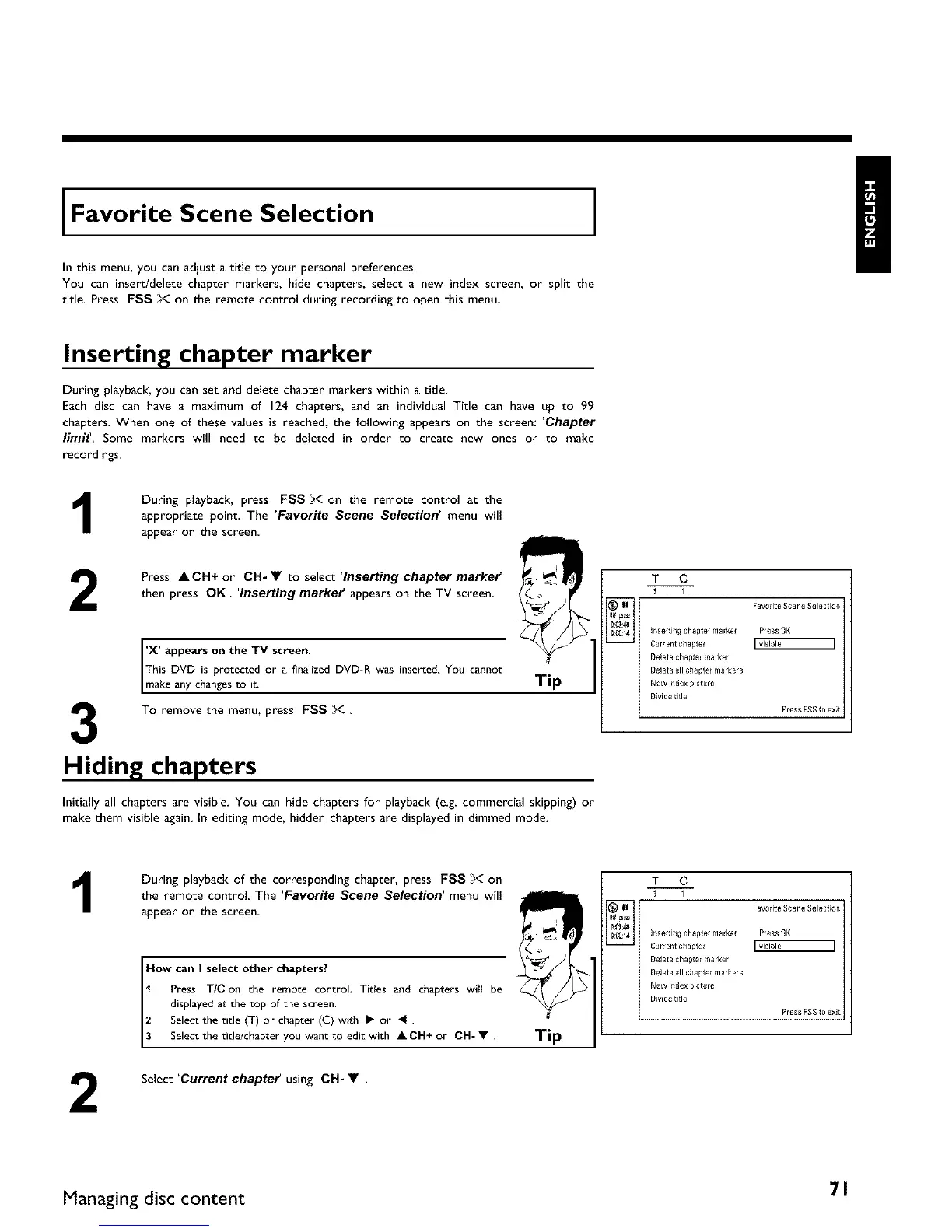 Press • CH+ or CH- • to select 'Inserting chapter markef