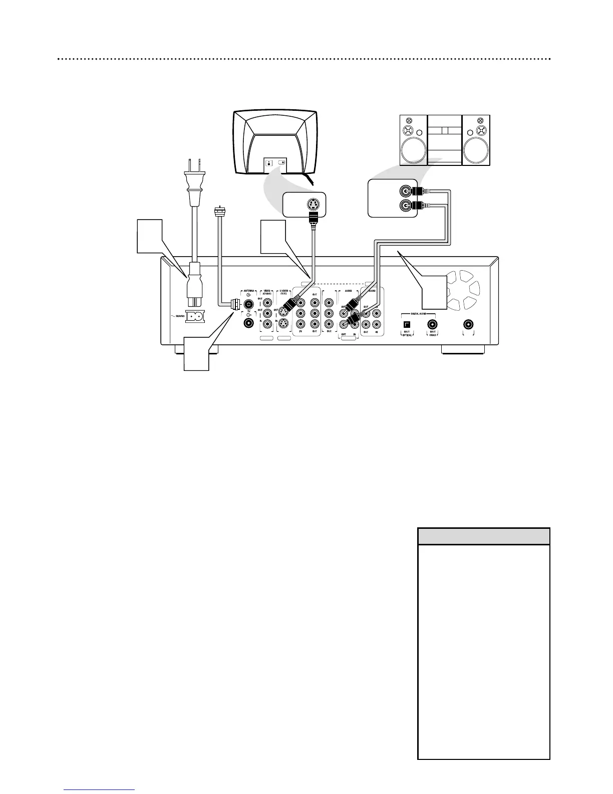 Connect the power cords of the DVD Recorder, Stereo, and TV to