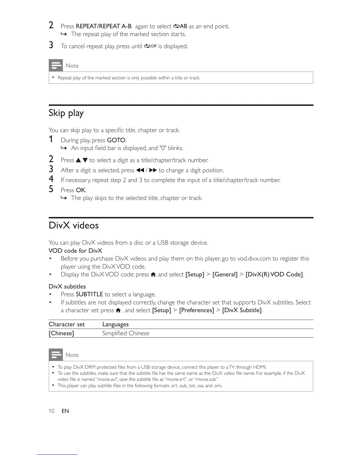If subtitles are not displayed correctly, change the character set that supports DivX subtitles. Select
