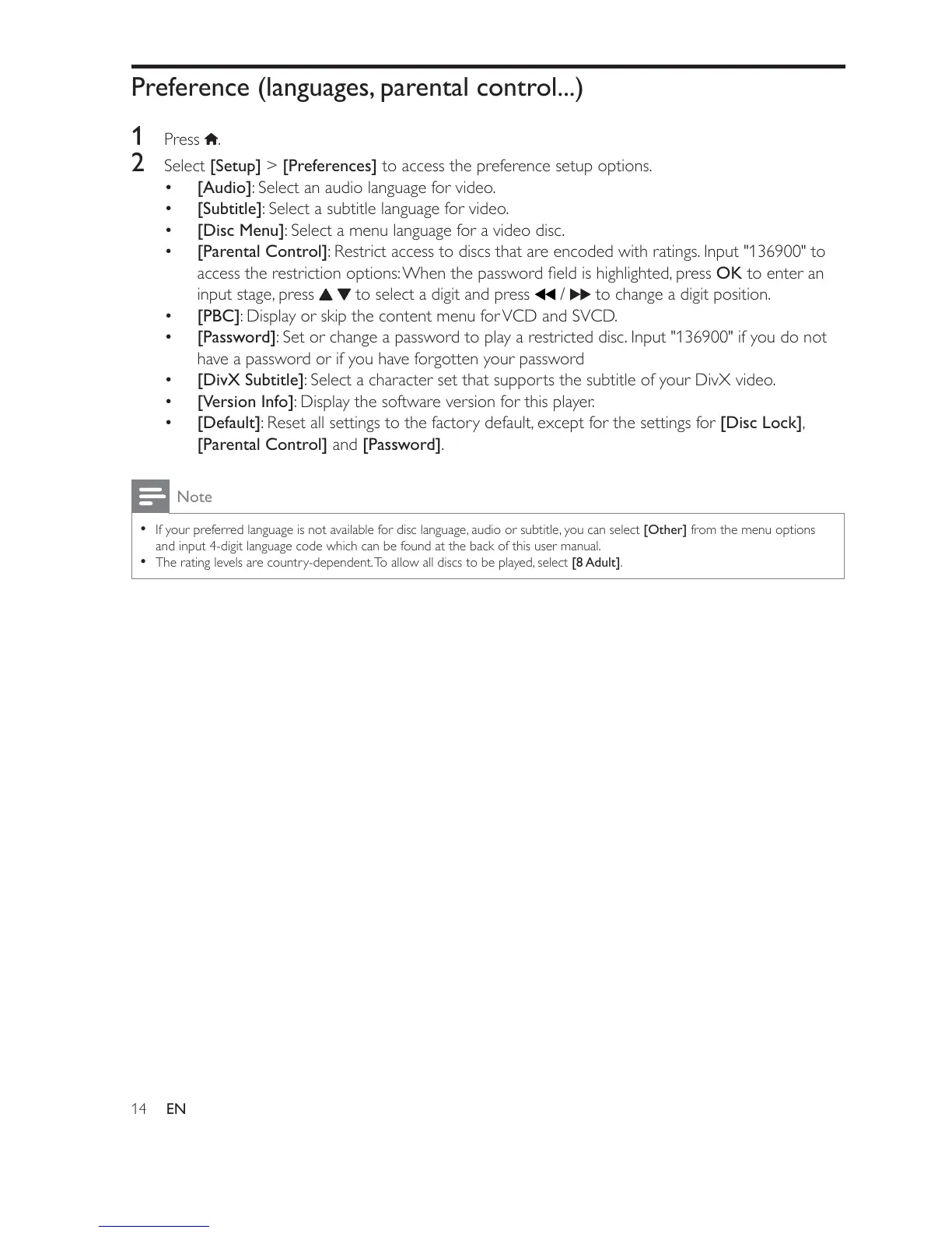 The rating levels are country-dependent. To allow all discs to be played, select [8 Adult].