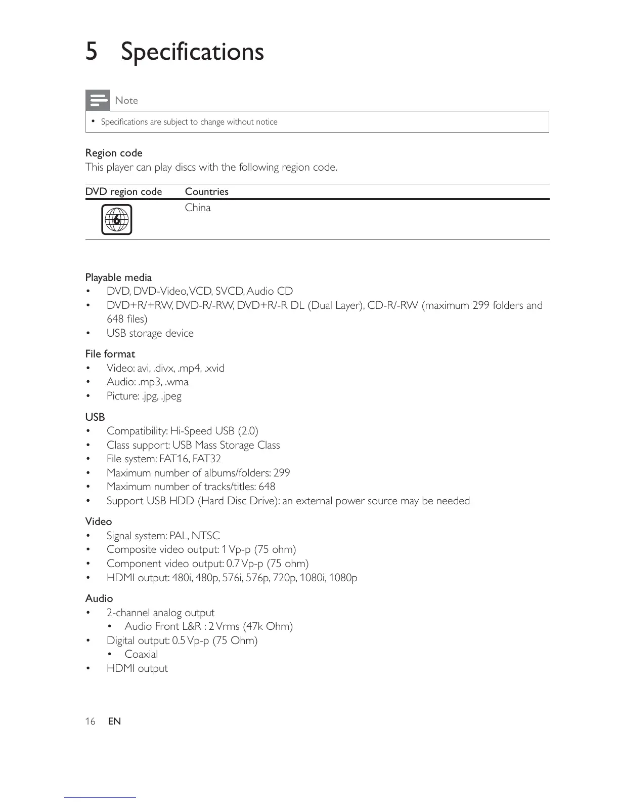 HDMI output: 480i, 480p, 576i, 576p, 720p, 1080i, 1080p