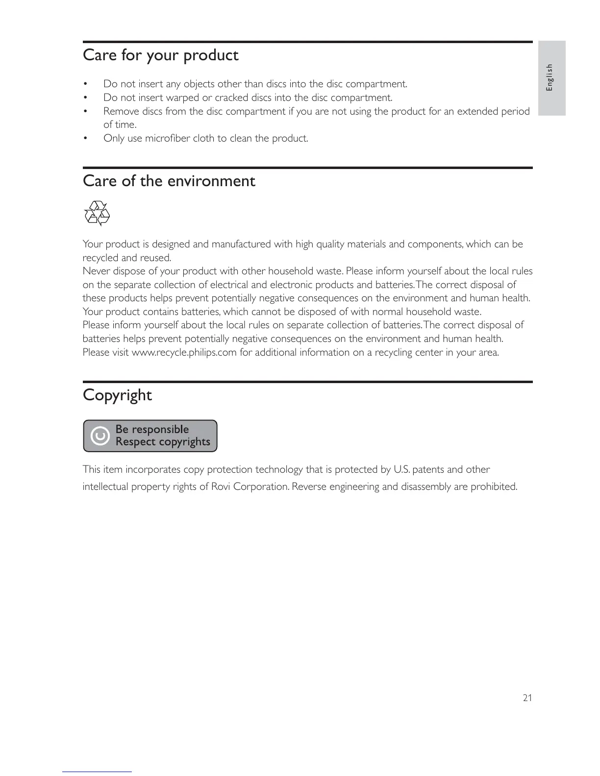 Never dispose of your product with other household waste. Please inform yourself about the local rules