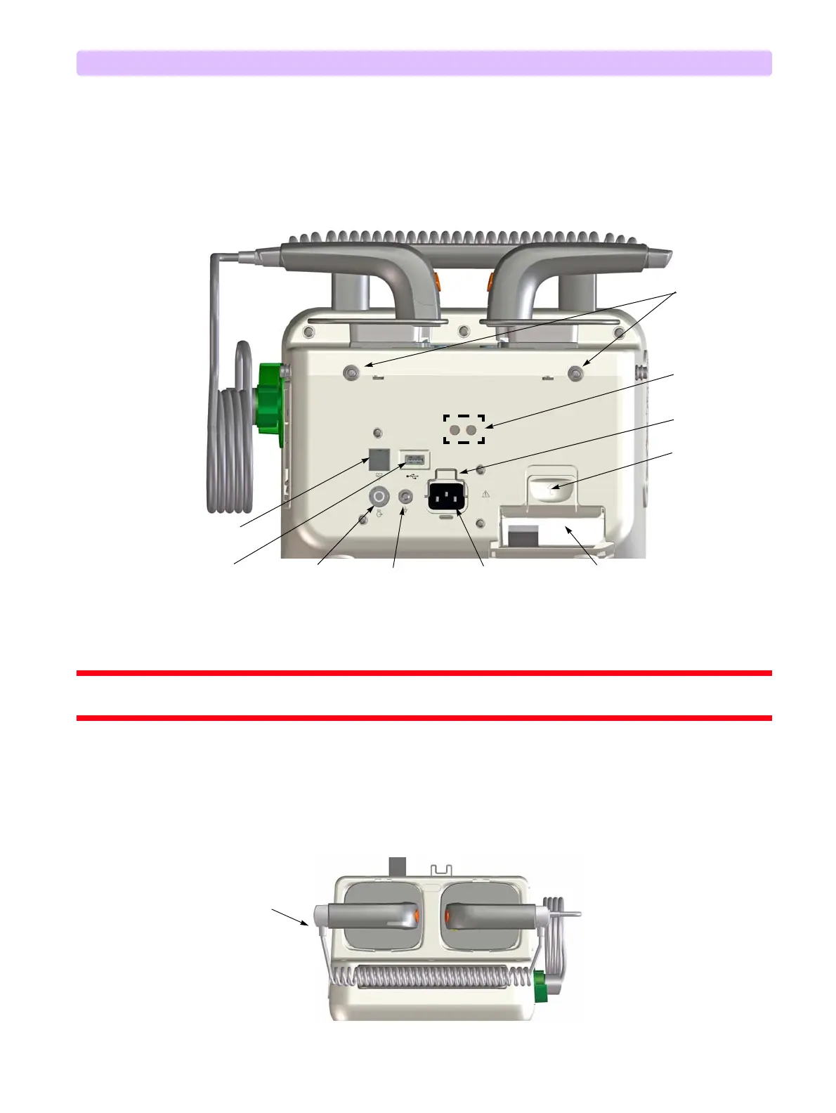 the AC power connection, the ECG Out jack to connect to an external monitor, the USB port, the