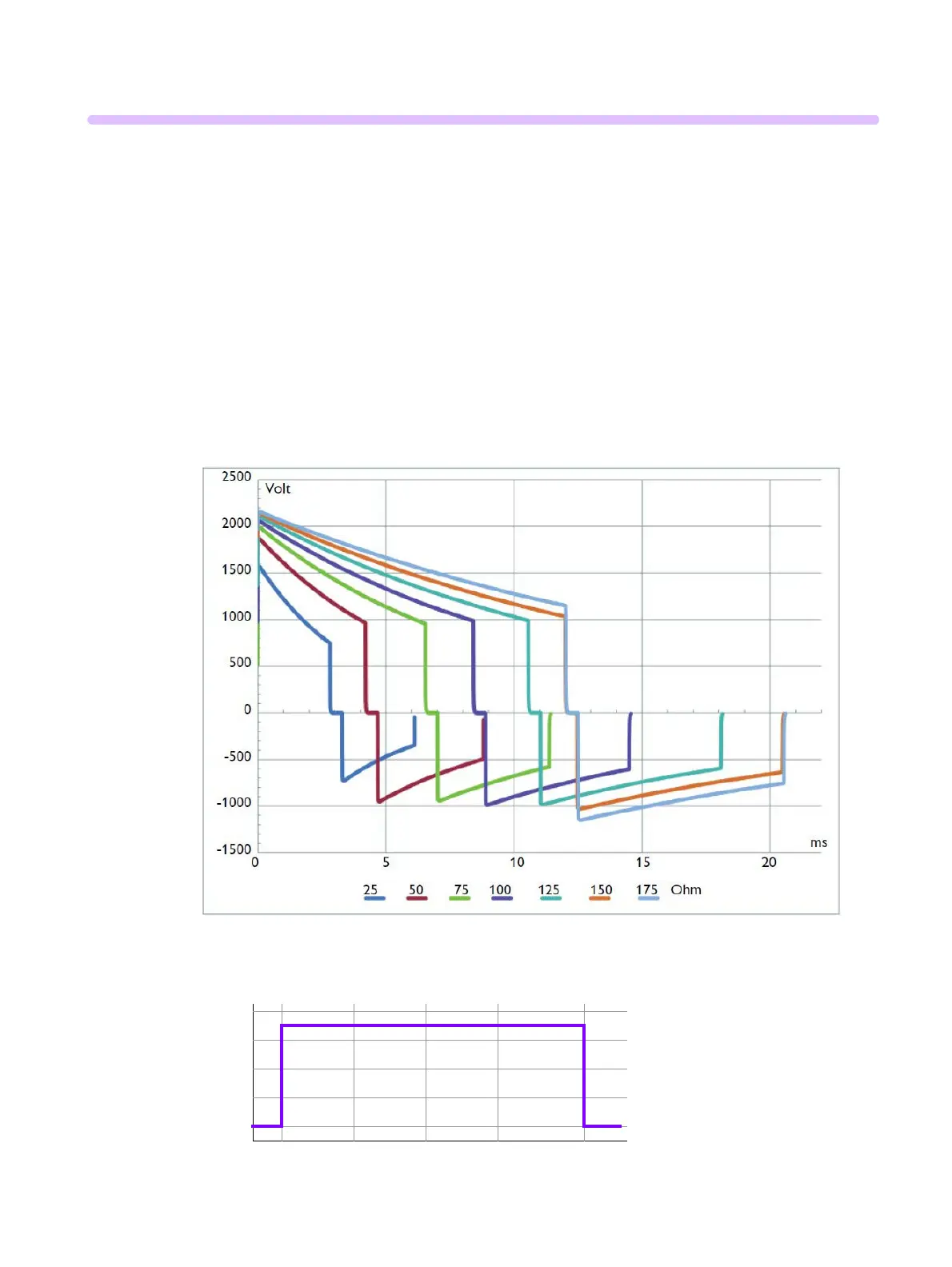 The following diagrams show the waveforms of a 200-J shock and of a pacing pulse.