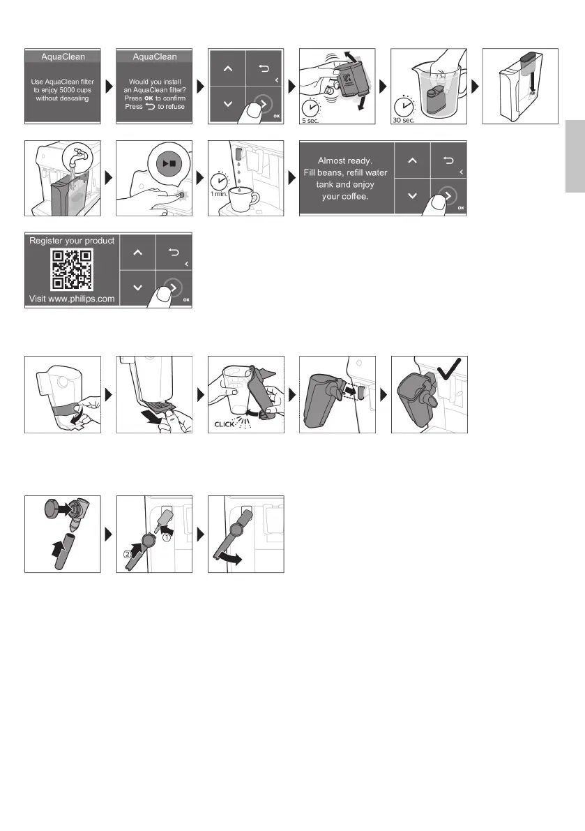 1 Llene el depósito de agua con agua del grifo y la tolva de granos, con granos.