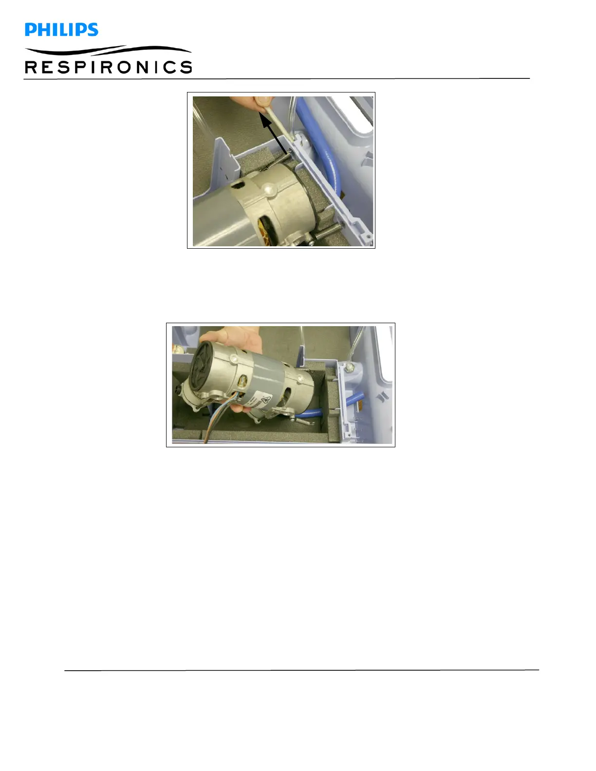 Slightly lift the back of the compressor while threading the blue hose through the hole in the