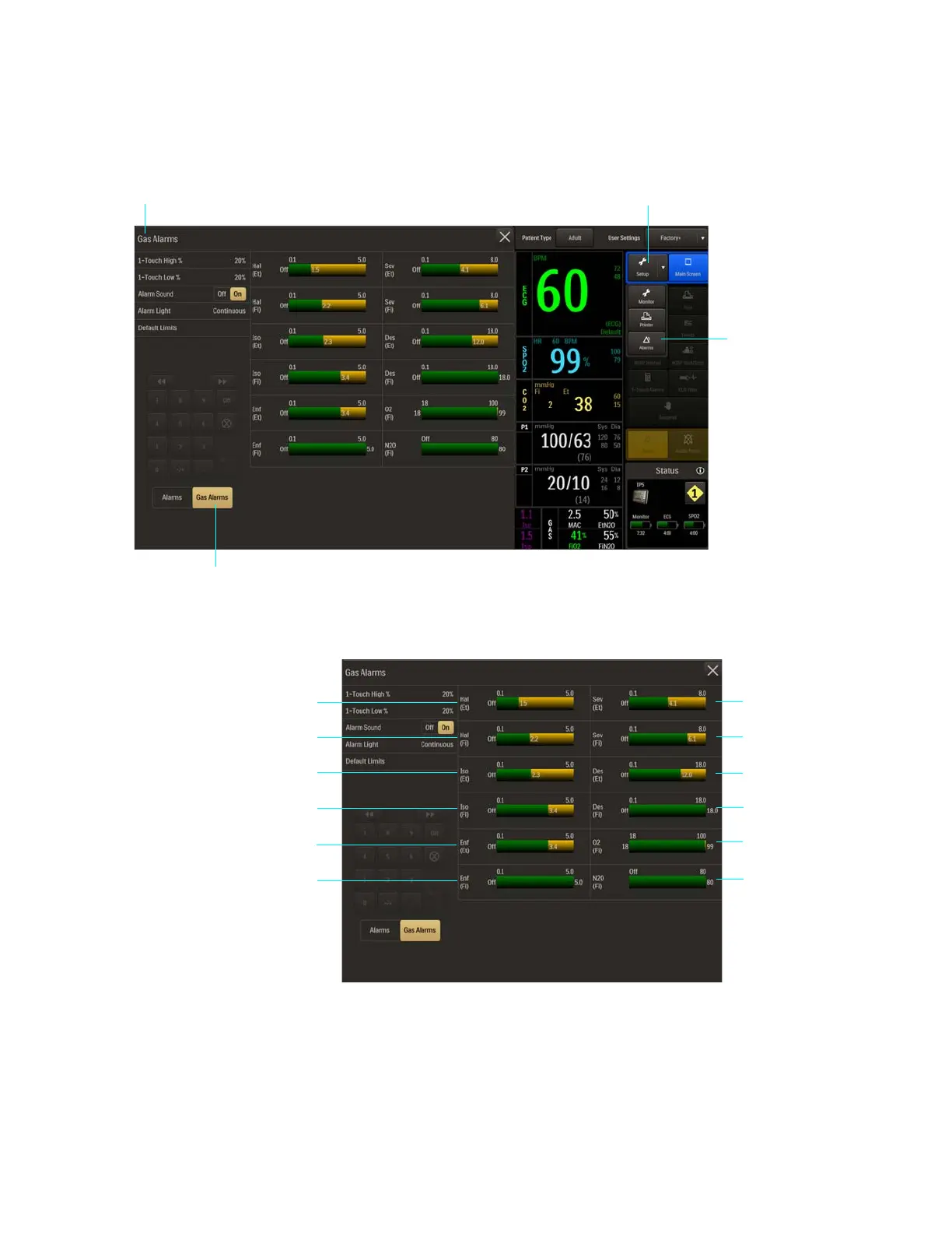 Lowerandupperalarmlimitsettingsforagentsandgasesareillustratedbelow.