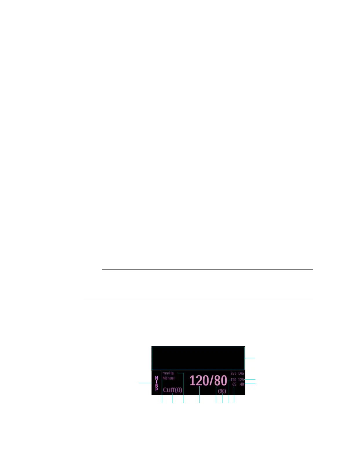 TheNIBPmeasurementsaredisplayedasnumericinformationintheNIBPVSbox.Otherdata,