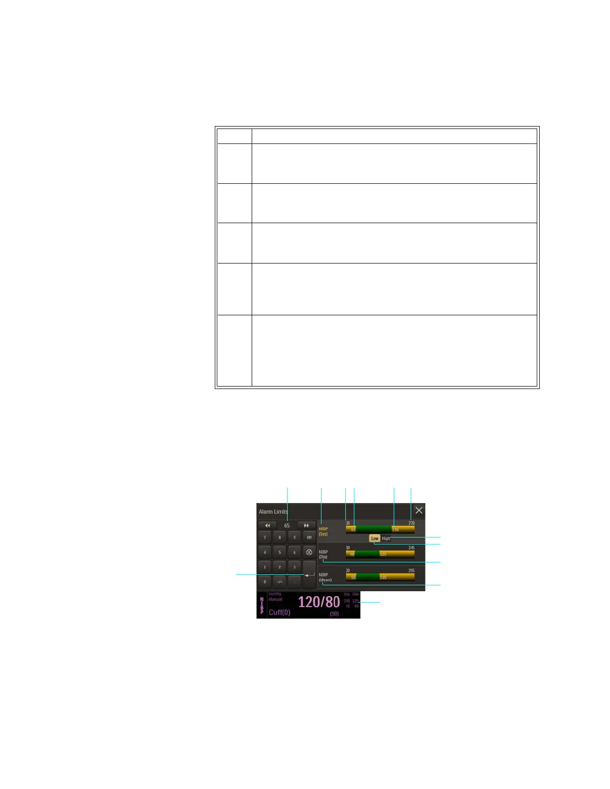 TheNIBPAlarmLimitsmenucanbeaccessedbytouchingthealarmlimitsettingsintheNIBPVS