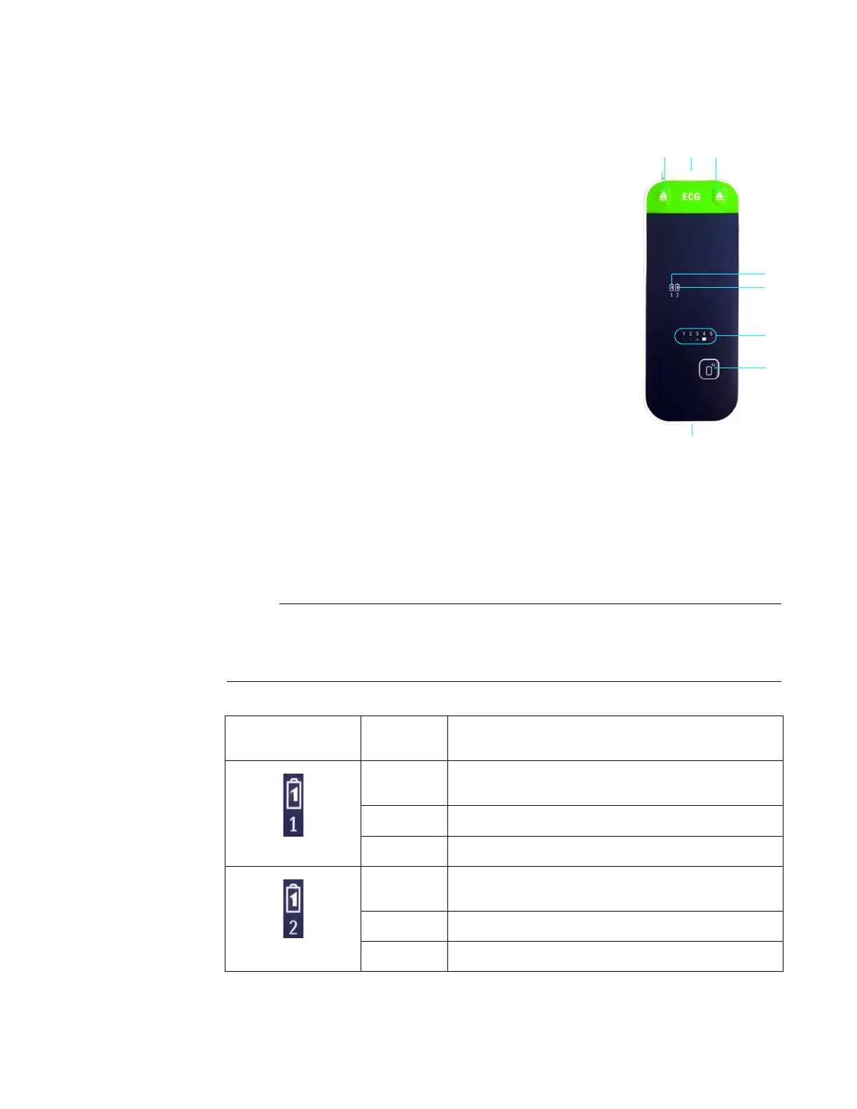 Batteryindicatorsprovidechargestatusin dicationsforeachbatteryusedbythewECGmodule,