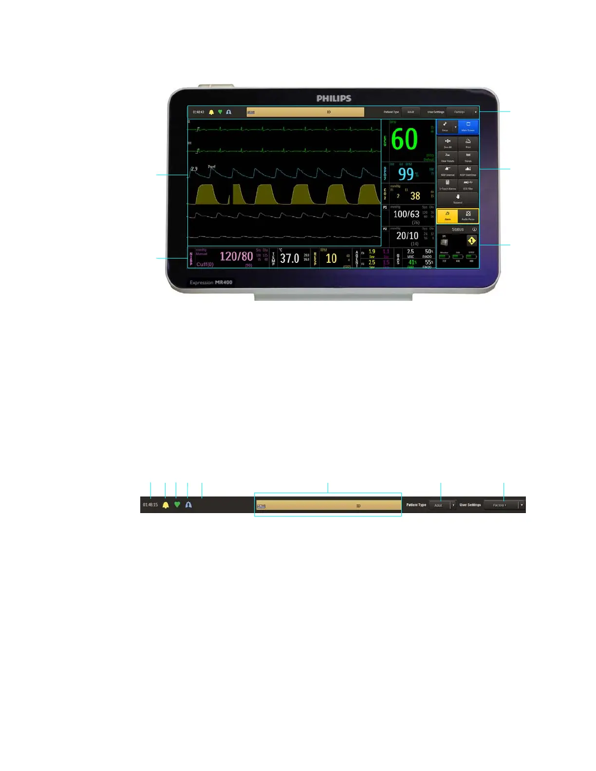 Theinformationbarprovidesgeneraluse,vitalsigndetectionandpatientinformation.