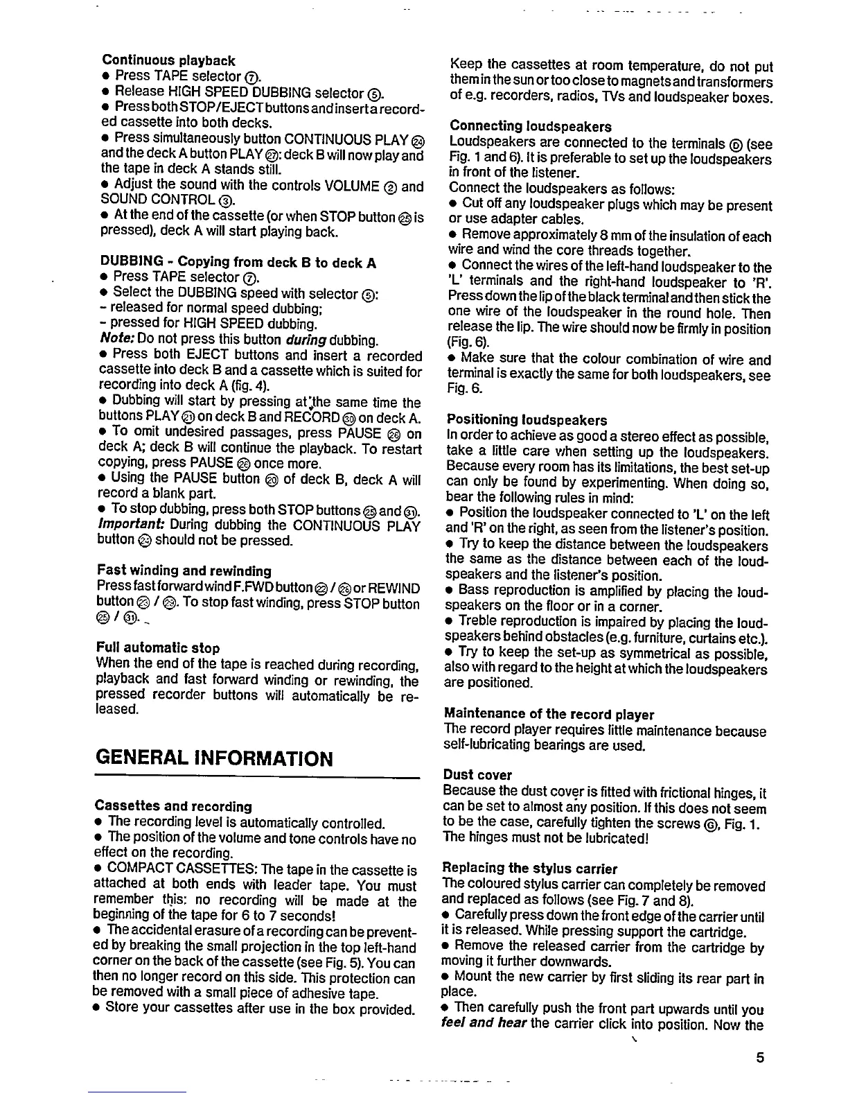 Philips F1275 - Advanced Cassette Operations; Continuous Playback; Dubbing; Fast Winding and Rewinding